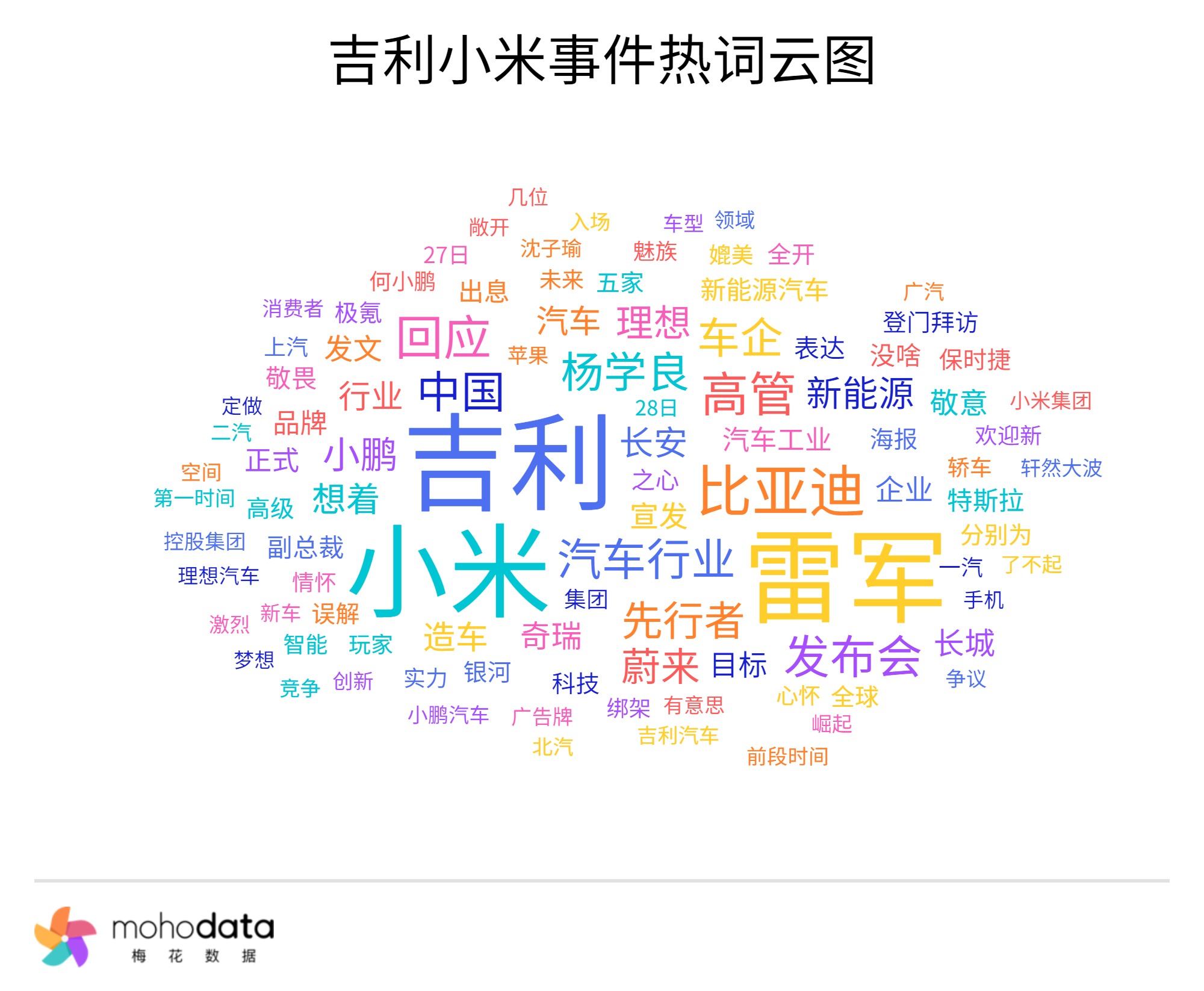 声量热词方面,热词云图如下所示,其中“吉利”“小米”“雷军”“杨学良”“回应”“发布会”“先行者”“汽车行业”、“宣发”、“发文”等词汇排名较前。
