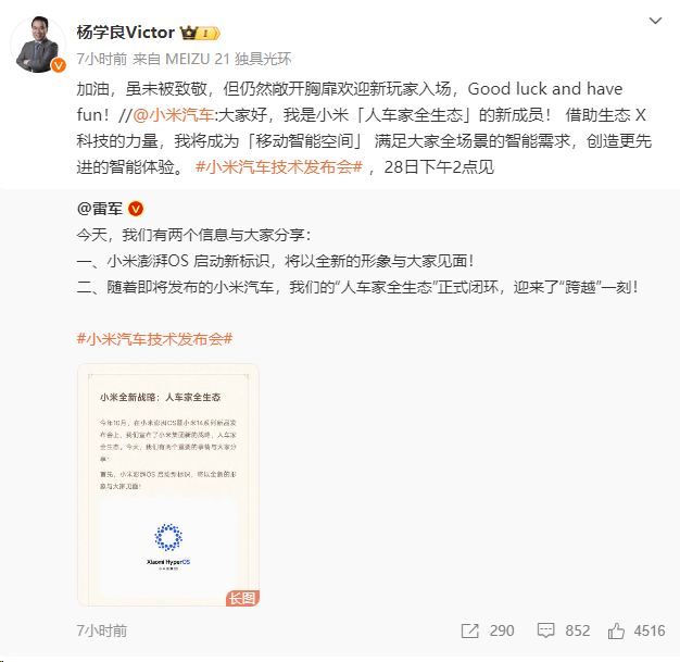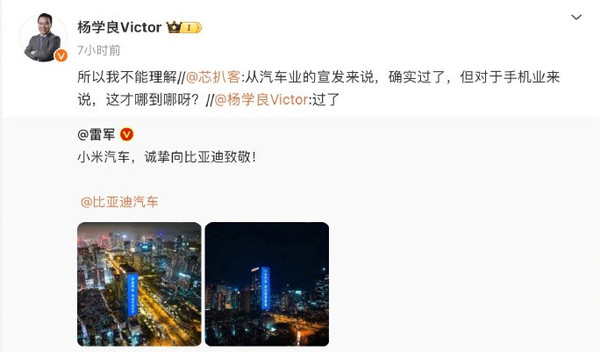 但此后杨学良微博表示,小米汽车的宣发过了,并表示不能理解。