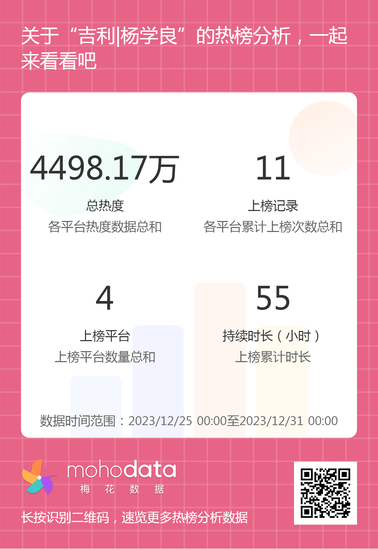 热搜方面,此次吉利小米事件相关热搜热度总计4498.17万,上榜记录11次,上榜平台4家,持续时长35小时。详情可扫描以下二维码查看。