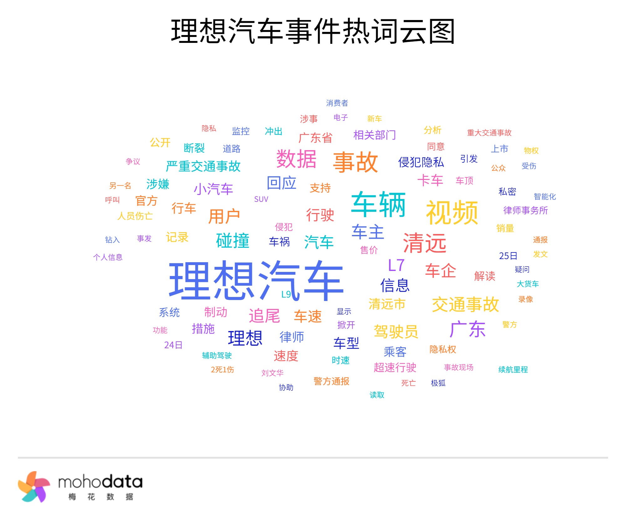 声量热词方面,热词云图如下所示,其中“理想汽车”“视频”“事故”“清远”“数据”“碰撞”“追尾”“L7”“车速”等词汇排名较前。