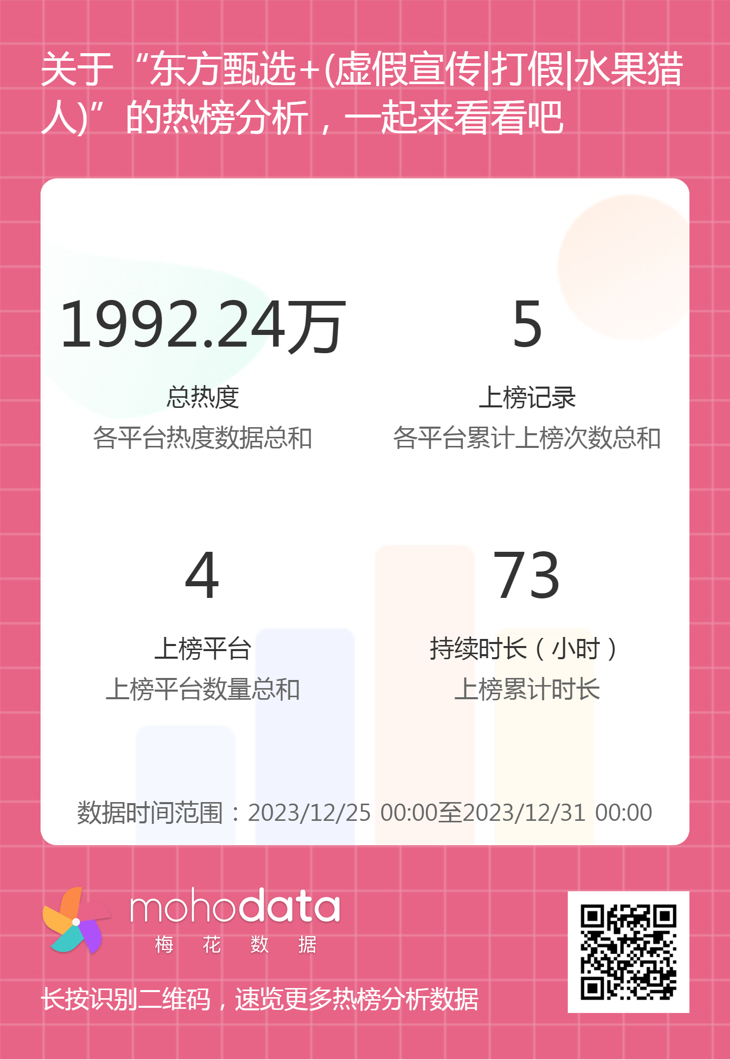 热搜方面,东方甄选事件相关热搜热度总计1992.24万,上榜记录5次,上榜平台4家,持续时长73小时。详情可扫描以下二维码查看。