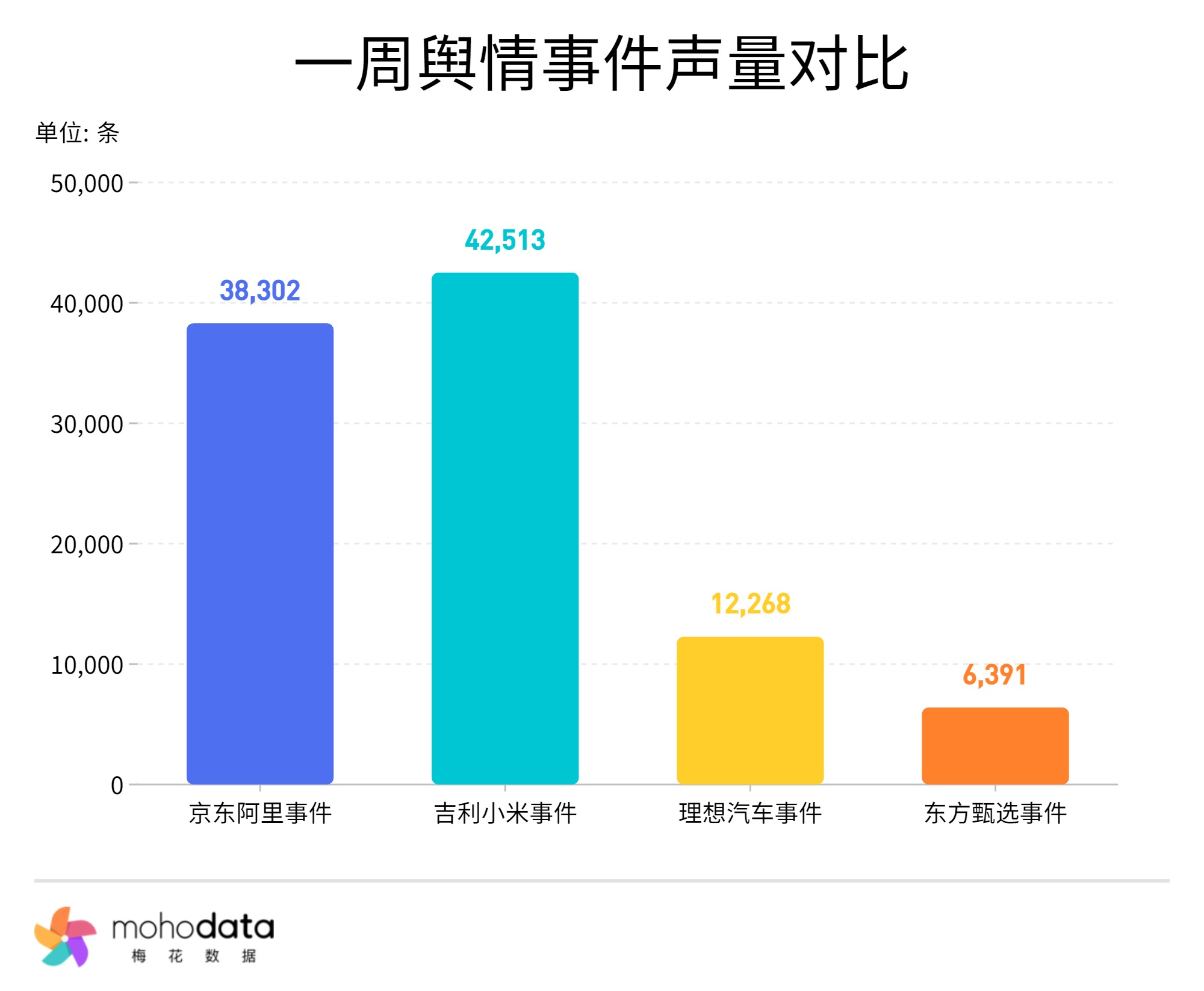 舆情声量方面,监测期间内主要舆情当中,“吉利小米事件”声量最高,共监测到舆情声量42513条,其次“京东阿里事件”舆情声量为38302条, “理想汽车事件”舆情声量为12268条,“东方甄选事件”舆情声量为6391条。