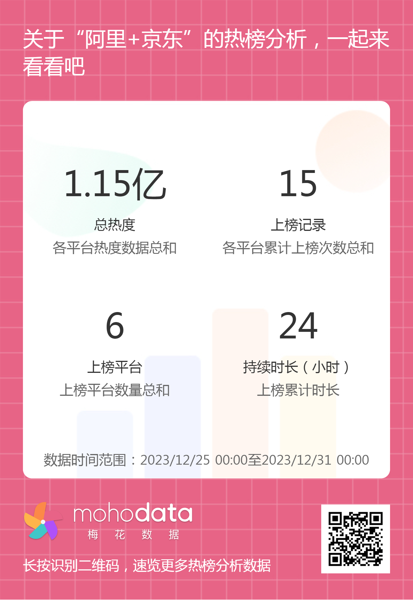 热搜方面,此次京东阿里事件相关热搜热度总计1.15亿,上榜记录15次,上榜平台6家,持续时长24小时。详情可扫描以下二维码查看。
