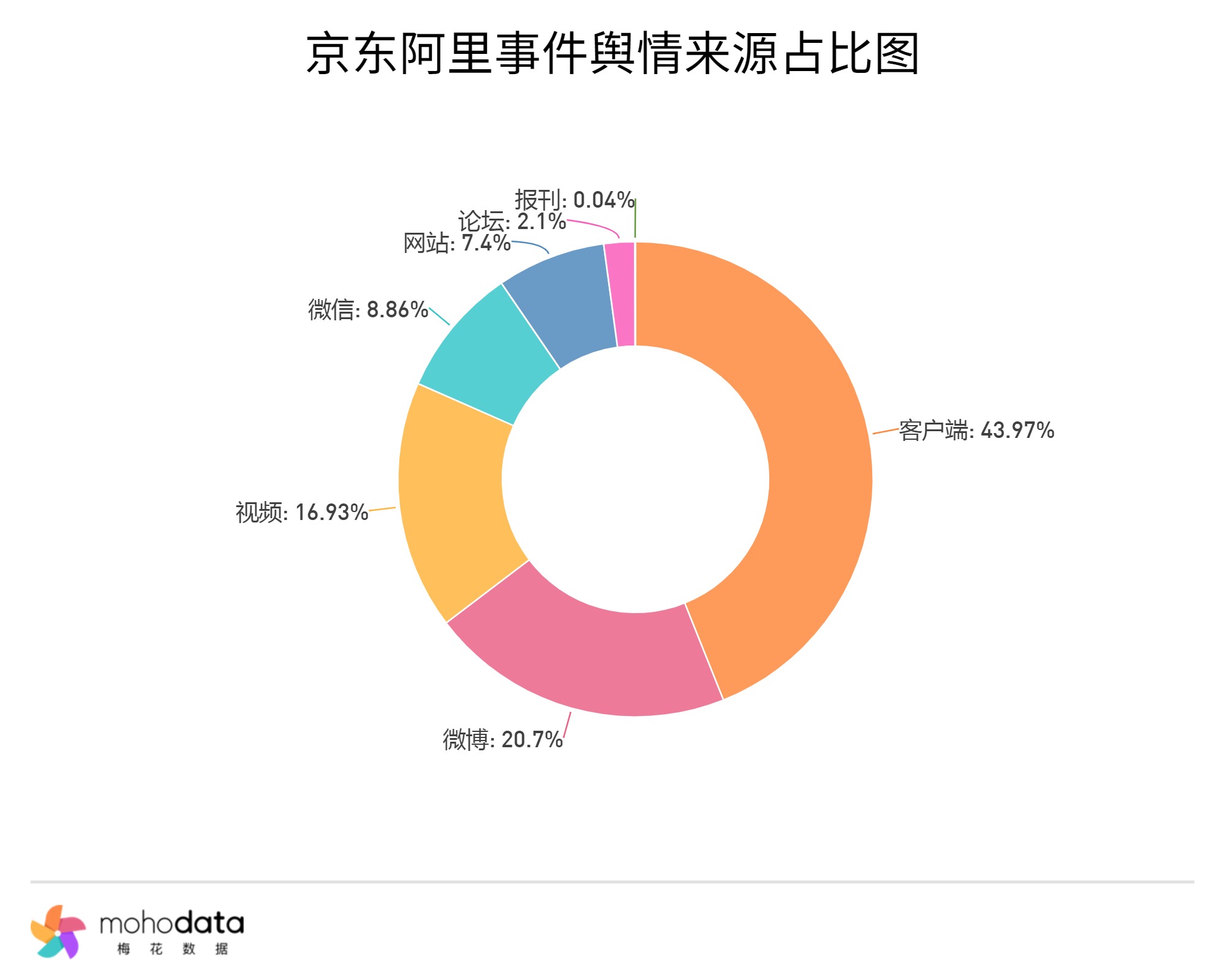 其中信息来源分布图如下图所示,声量主要集中在客户端,客户端占比43.97%,微博占比20.70%,视频占比16.93%,其他信息来源占比不超过10%。