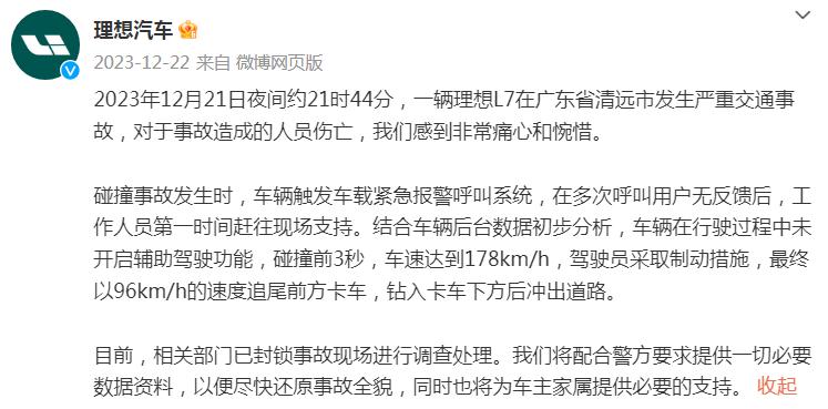 12月22日,理想汽车官方微博发文回应称:2023年12月21日夜间约21时44分,一辆理想L7在广东省清远市发生严重交通事故,对于事故造成的人员伤亡,我们感到非常痛心和惋惜。