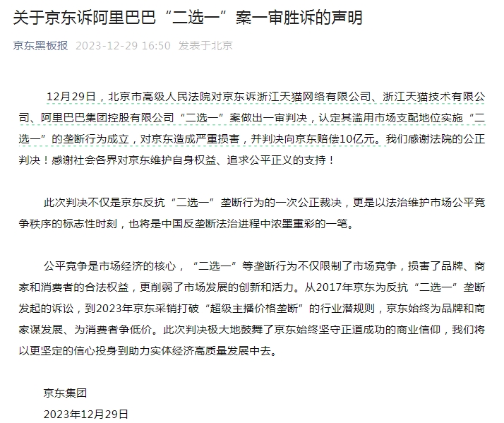 12月29日,京东黑板报公众号发文称,北京市高级人民法院对京东诉浙江天猫网络有限公司、浙江天猫技术有限公司、阿里巴巴集团控股有限公司“二选一”案做出一审判决,认定其滥用市场支配地位实施“二选一”的垄断行为成立,对京东造成严重损害,并判决向京东赔偿10亿元。