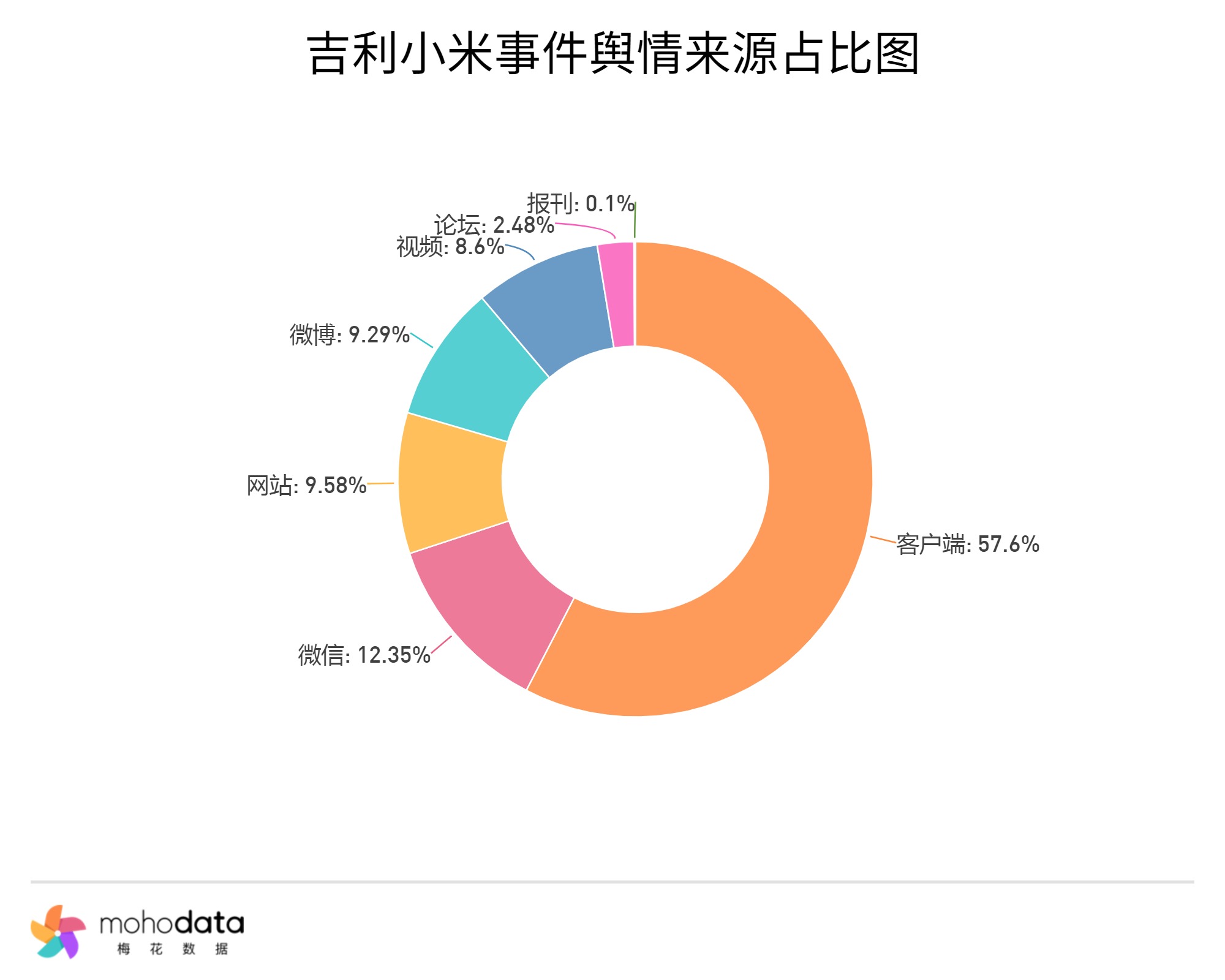 其中信息来源分布图如下图所示,声量主要集中在客户端,客户端占比57.60%,微信占比12.35%,其他信息来源占比不超过10%。