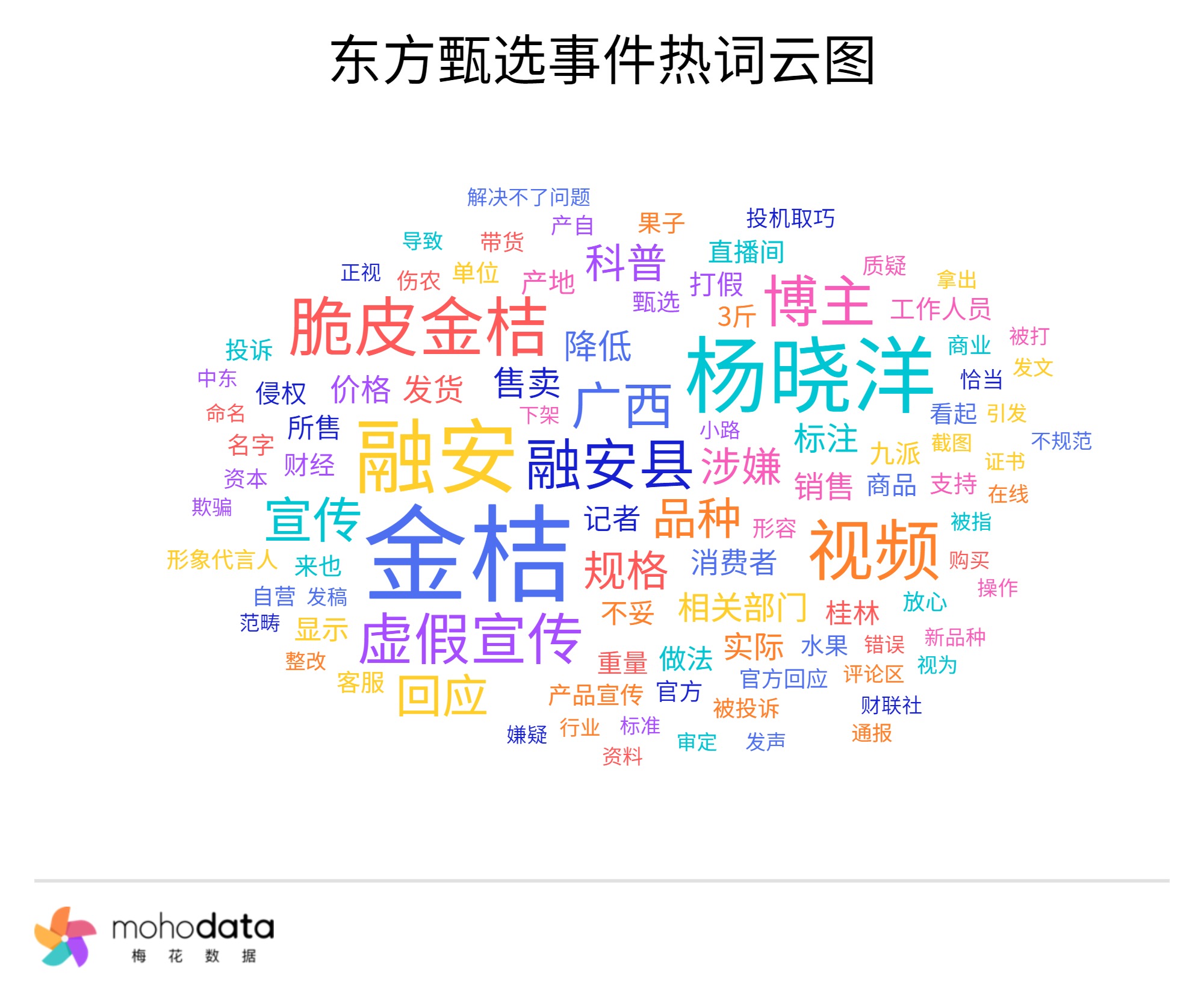 声量热词方面,热词云图如下所示,其中“金桔”“杨晓洋”“融安”“视频”“脆皮金桔”“虚假宣传”“宣传”“品种”“科普”等词汇排名较前。