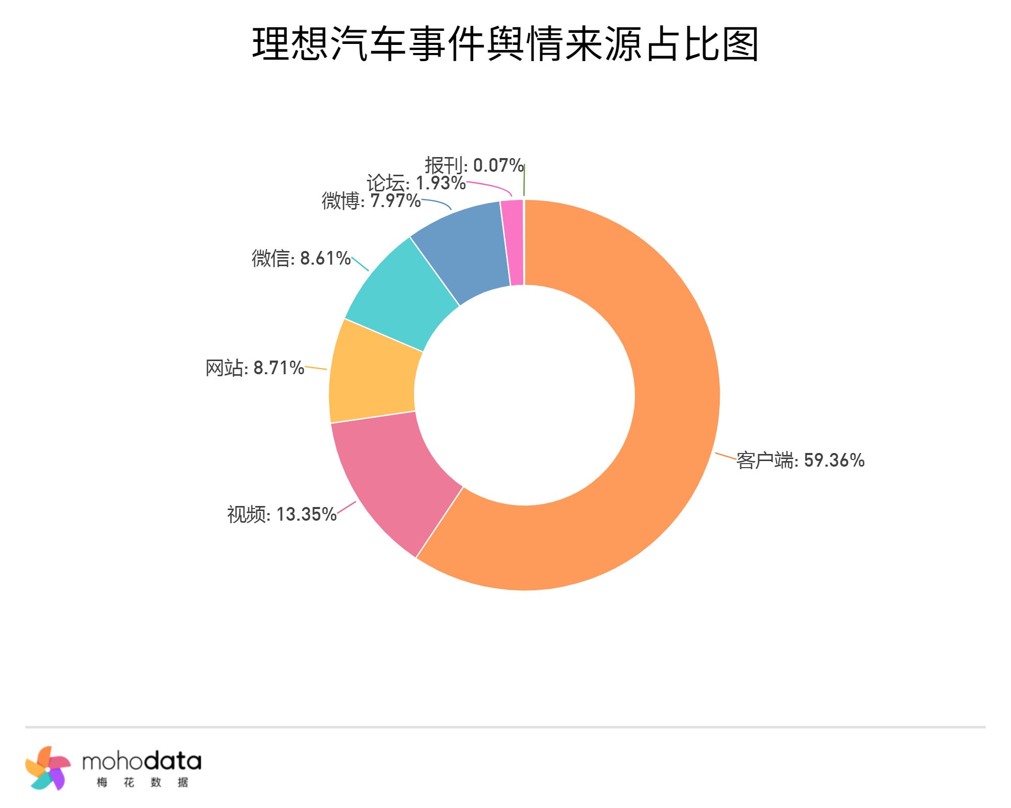 其中信息来源分布图如下图所示,声量主要集中在客户端,客户端占比59.36%,视频占比13.35%,其他信息来源占比不超过10%。