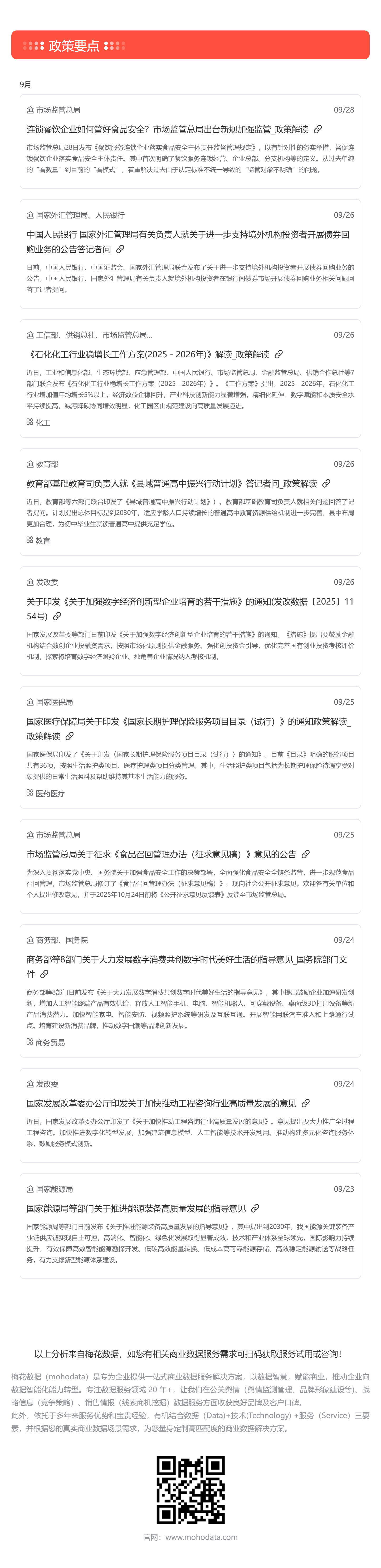 根据梅花数据舆情监测要政盘点统计,监测期间共收录重要政策信息共计48条,其中涉及餐饮、食品、外贸、能源、教育等多个领域,建议重点关注《食品召回管理办法(征求意见稿)》、《餐饮服务连锁企业落实食品安全主体责任监督管理规定》等政策。