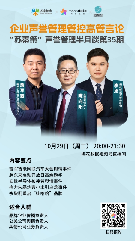 新的一周开始,本周梅花数据携手苏秦智库举办第35期声誉管理半月谈直播,重点分析雷军智能网联汽车大会舆情事件与胖东来启动开放日高端游学,欢迎感兴趣的朋友扫描文末海报预约直播。