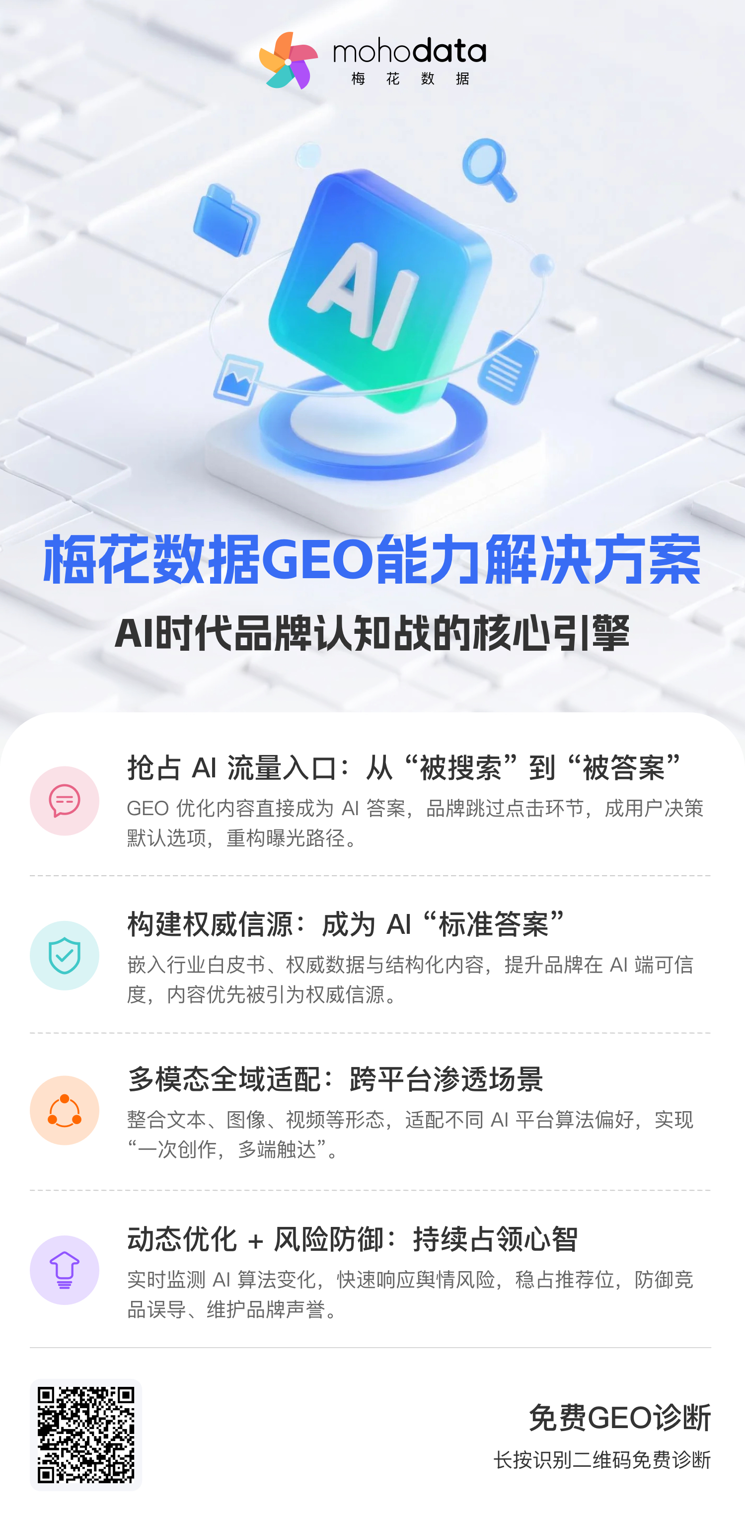 扫描下方二维码,梅花数据将依据专业GEO诊断标准,免费为您评估品牌在豆包、Kimi、元宝等主流AI平台的表现,并提供定制化诊断报告与优化建议,助您快速启动GEO布局,让品牌赢在AI认知的起跑线!